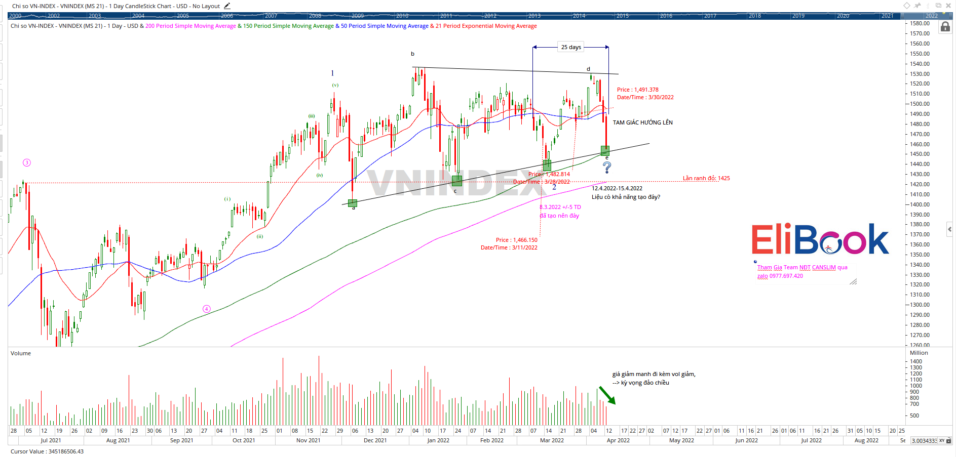 Lằn ranh đỏ, nơi chúng tôi chuyển sang kịch bản Down Trend là khi chỉ số VN-Index phá thủng 1425, cũng đồng thời là MA200 ngày.