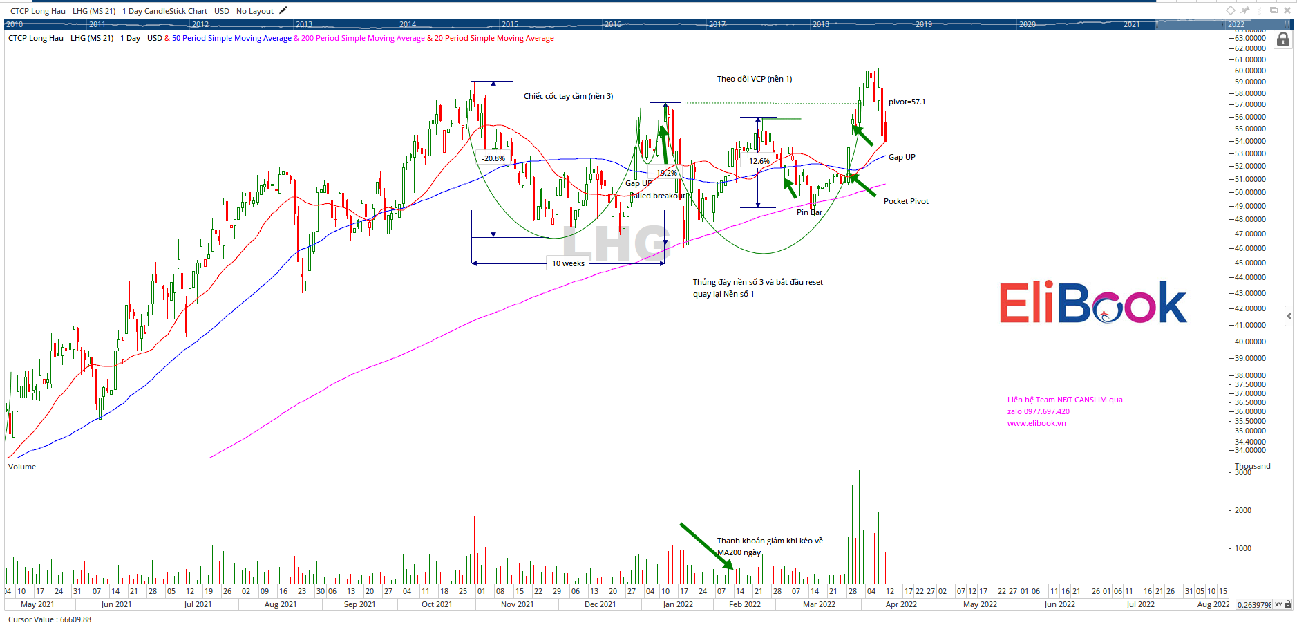 Cổ phiếu LHG sau khi breakout mẫu hình Chiếc Cốc vào ngày 31.3.2022, vượt qua điểm mua pivot tại 57,300 thì nay giá cổ phiếu đang nằm thấp hơn điểm mua này. LHG vẫn còn nằm trên MA20 ngày. Trong phiên hôm nay, LHG cố gắng tăng điểm nhưng lực bán mạnh toàn thị trường khiến cổ phiếu này giảm nhẹ -0.9% vào cuối phiên.