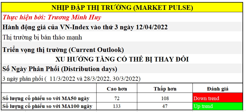 Vì thời gian 25 ngày trôi qua, ngày phân phối 8/3/2022 tiếp tục bị loại bỏ. Như vậy, chỉ số VNIndex chỉ còn 3 ngày phân phối, và đều là những ngày phân phối nhẹ. Trong 3 phiên tiếp theo, ngày phân phối 11/3/2022 tiếp tục bị loại bỏ vì quy tắc thời gian 25 ngày.