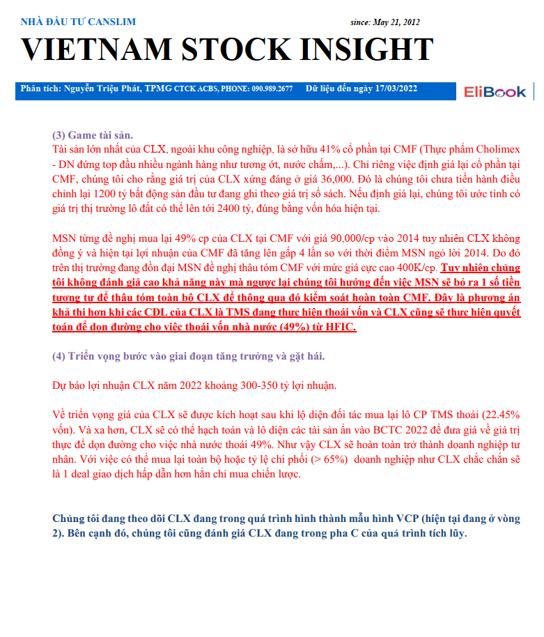 Trong khi đó Team NĐT CANSLIM có báo cáo chi tiết về cổ phiếu CLX với dự phóng lợi nhuận năm 2022 sẽ khoảng 300-350 tỷ và việc định giá lại cổ phiếu tại CMF giúp CLX có giá mục tiêu 36,000.