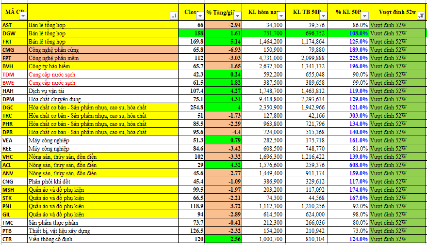 Danh sách cổ phiếu vượt đỉnh 52 tuần vẫn cho thấy sóng ngành ở Bán Lẻ, Công Nghệ, Nước, Vận Tải, Hóa Chất (Cao Su), Dệt May, Thủy Sản.