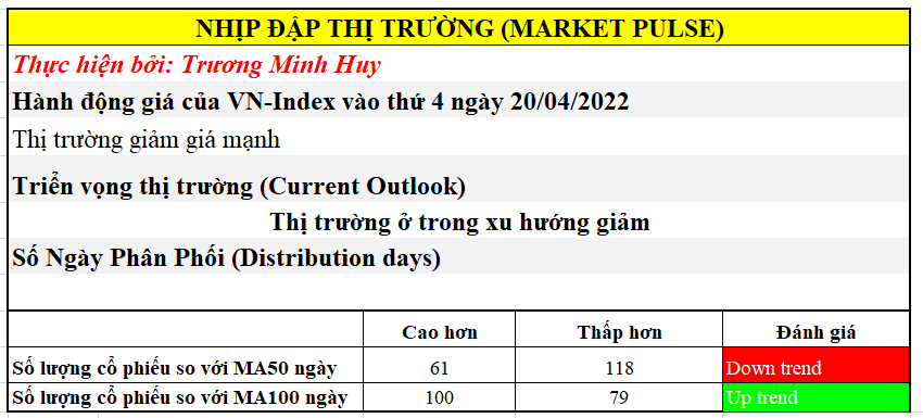 Hộp Nhịp Đập Thị Trường của Team NĐT CANSLIM đã chuyển trạng thái thị trường sang đèn đỏ, tức “THỊ TRƯỜNG Ở TRONG XU HƯỚNG GIẢM”, sau khi để mất MA200 ngày, đồng thời là ngưỡng 1425 điểm. Điều này yêu cầu nhà đầu tư cần cắt lỗ sớm, chốt lãi nhanh, tăng cường nắm giữ tiền mặt, hạ tỷ trọng cổ phiếu.