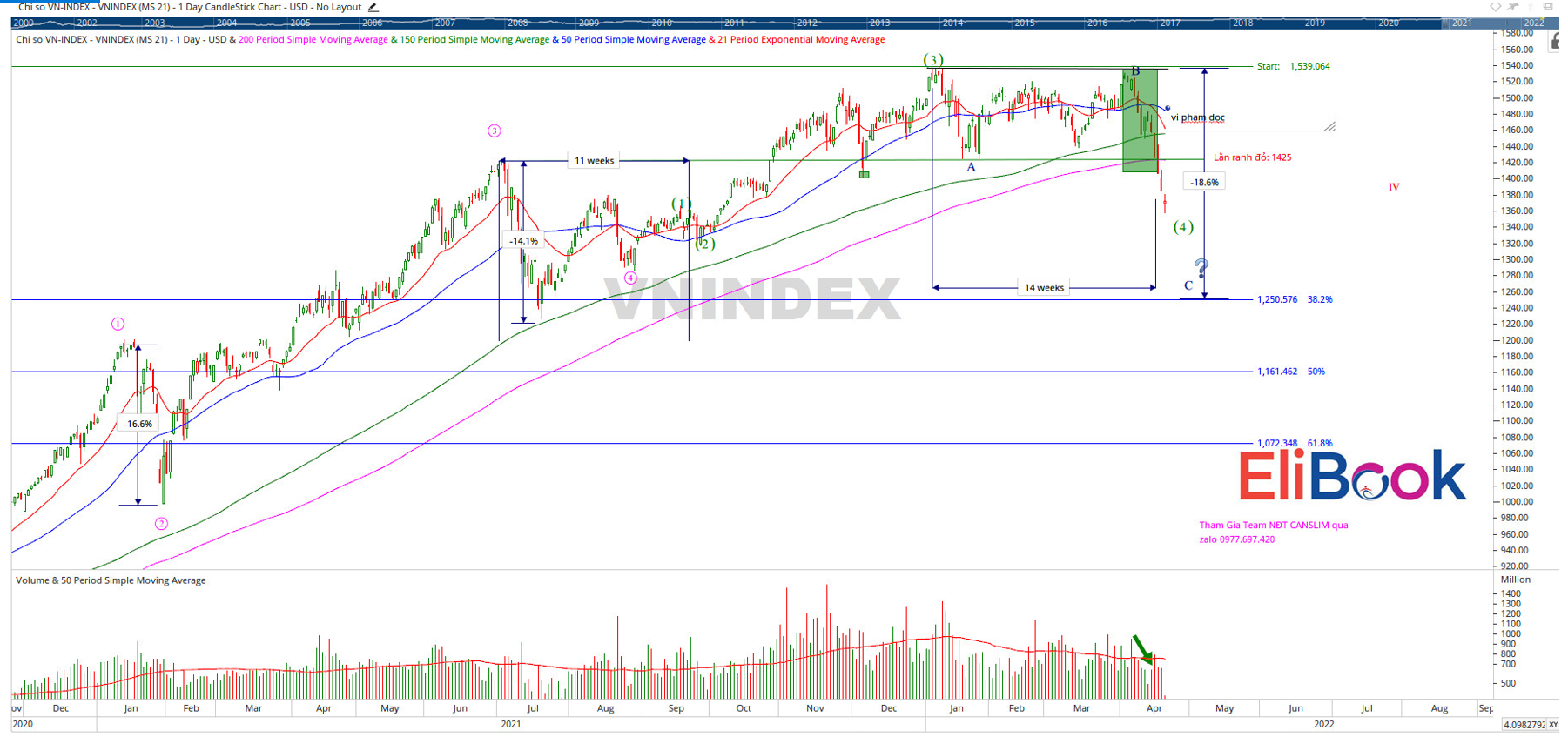 Chỉ số VN-Index đã xuất hiện Vi phạm dọc khi có liên tiếp xuất hiện nhiều ngày giảm điểm mạnh với khối lượng lớn từ đỉnh. Hiện tại, chúng ta đang quan sát thấy số ngày giảm giá chiếm áp đảo số ngày tăng giá. Bạn có thể nhìn thấy vài ngày giảm đi kèm 1-2 ngày hồi phục trở lại. Chỉ số VN-Index đã có tổng cộng 8 ngày giảm giá mạnh trong khoảng thời gian vỏn vẹn hơn 2 tuần, đường MA200 ngày chính thức bị xuyên thủng.