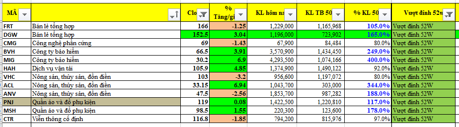 Danh sách cổ phiếu vượt đỉnh hôm nay tiếp tục sụt giảm, chỉ còn lại 12 cổ phiếu tham gia vào danh sách vượt đỉnh.