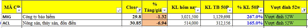 Danh sách cổ phiếu vượt đỉnh hôm nay còn sót lại 2 cổ phiếu thuộc 2 nhóm ngành là thủy sản và bảo hiểm.