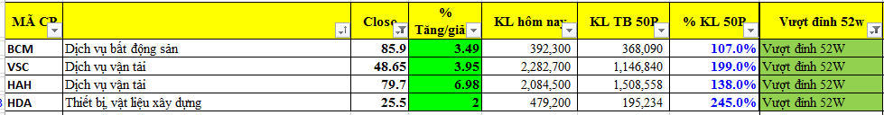 Danh sách cổ phiếu vượt đỉnh vẫn còn khá khiêm tốn với chỉ 4 cổ phiếu tham gia vào danh sách này trong khi cũng có 4 cổ phiếu đang phá đáy 52 tuần.