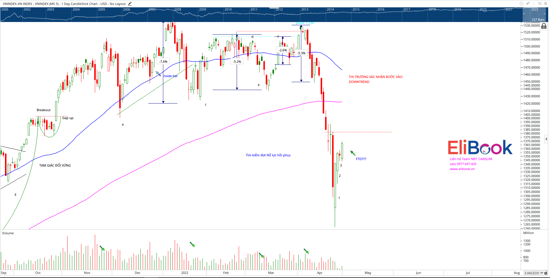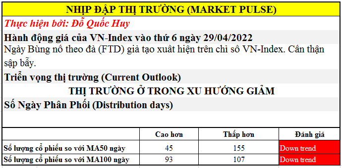 Ngày giảm mạnh 29/4/2022 với mức giảm gần 5% tạo ra một vùng kháng cự cứng và chỉ số VN-Index cần phải vượt qua nếu muốn kéo thị trường quay trở lại Uptrend.