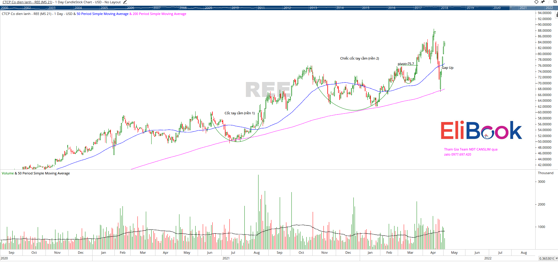 Cổ phiếu REE sau khi kéo về thủng MA50 ngày và chạm vào hỗ trợ MA200 ngày đã tăng trở lại vượt qua điểm pivot=75,700 của mẫu hình Chiếc Cốc Tay Cầm (nền giá số 2). Ngày 28/4/2022, REE mở Gap Up nhưng không tạo ra điểm mua hợp lệ vì khối lượng giao dịch chỉ tăng nhẹ so với thanh khoản bình quân (không đáp ứng tiêu chí tăng 1.5 lần so với thanh khoản bình quân khi mua theo Gap Up)