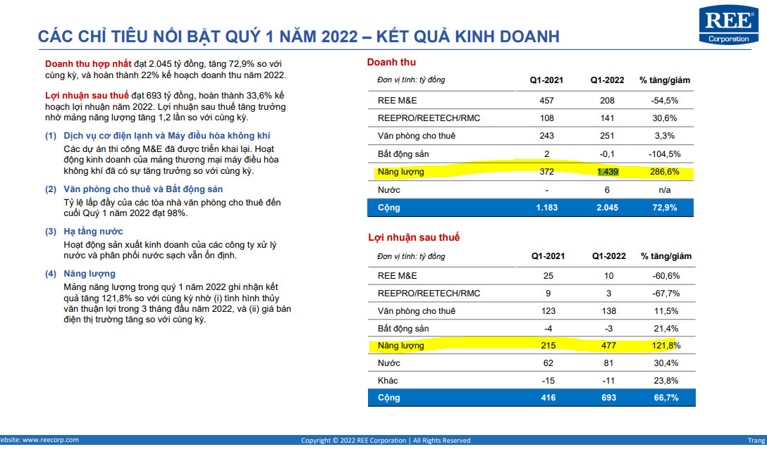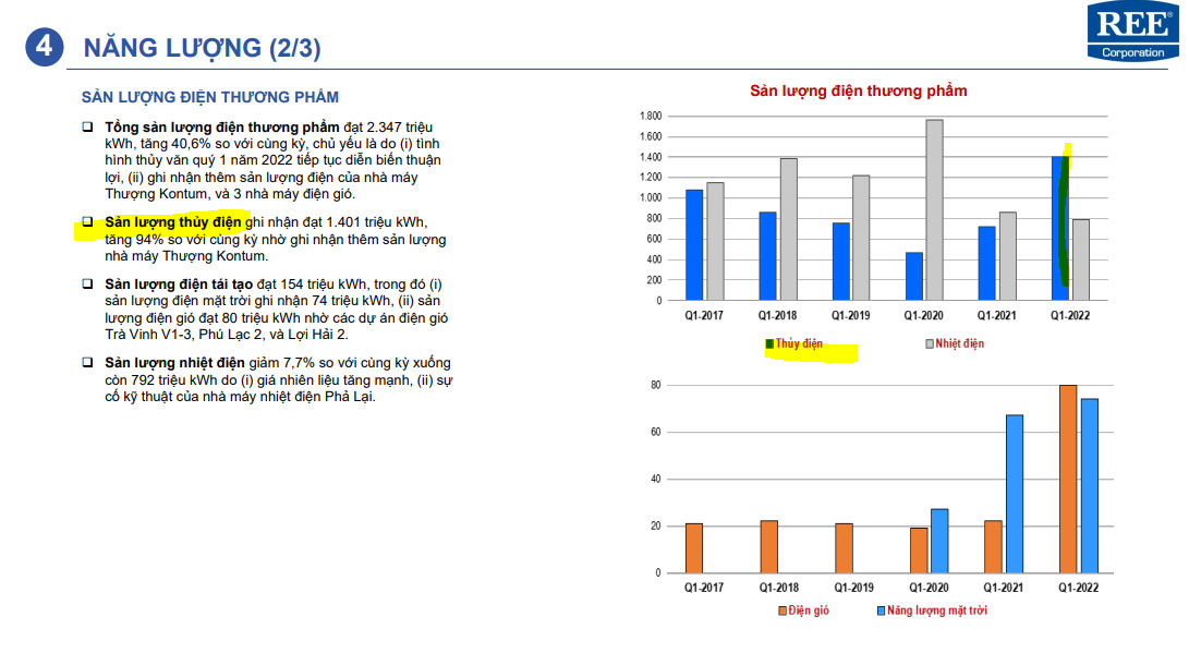 Lợi nhuận của REE tăng tốc chủ yếu đến từ đóng góp của mảng năng lượng, đặc biệt Thủy Điện. Trong quý 1.2022, mảng năng lượng đạt doanh thu 1439 tỷ, tăng +286% yoy và tương ứng lợi nhuận đạt 477 tỷ, tăng +121.8%. Tình hình thủy văn thuận lợi đã giúp cho mảng thủy điện có hoạt động kinh doanh tốt. Trong đó, việc REE nâng tỷ lệ sở hữu VSH trong năm 2021 bắt đầu mang lại quả ngọt. Riêng VSH có lợi nhuận sau thuế Q1.2022 đạt 404 tỷ đồng, tăng gần gấp 4 lần cùng kỳ, do nhà máy Thượng Kon Tum bắt đầu phát điện từ Q2/2021 nên cơ sở quý 1.2021 lầ nền thấp. Các công ty khác cũng có kết quả kinh doanh tích cực như TMP có lợi nhuận quý 1.2022 đạt 122 tỷ đồng, tăng 1.76 lần so với cùng kỳ. TBC có lợi nhuận 88 tỷ đồng trong quý 1.2022, tăng 18% yoy.