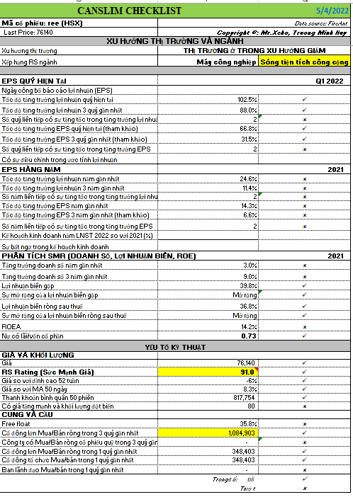Với Code33, REE đáp ứng chữ C trong CANSLIM. REE cũng đáp ứng chữ A khi tốc độ tăng trưởng lợi nhuận năm 2021 là 25%. Trong khi đó, tiêu chí SMR của được xếp ở mức B (Thang đo từ A -cao nhất xuống E-thấp nhất) khi lợi nhuận gộp biên mở rộng, ROE của công ty là 14%, chưa đỗ tiêu chí tối thiểu là 17%. Như vậy, REE đang tiệm cận dần với các tiêu chí CANSLIM.