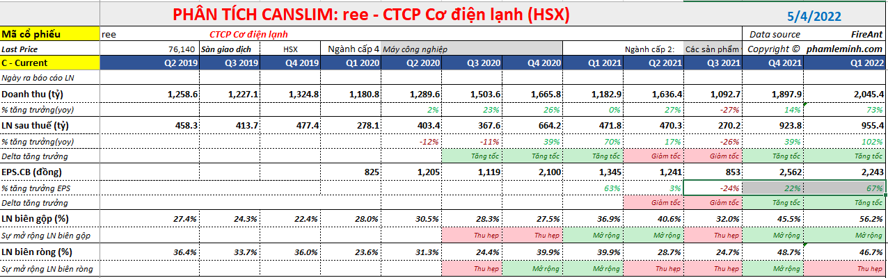 REE công bố báo cáo lợi nhuận quý 1.2022 rất tích cực và hình thành mẫu hình Code 33 của Phù Thủy Mark Minervini trong cuốn sách “Giao Dịch Như Một Phù Thủy Chứng Khoán”. Theo đó, tăng trưởng doanh thu ba quý gần nhất là -27%, +14% và +73%. Trong cùng thời gian, tăng trưởng lợi nhuận sau thuế lần lượt là: -26%, +39% và +102%. Như vậy, REE đang có sự tăng tốc trong tăng trưởng doanh thu và lợi nhuận. Tăng trưởng EPS cũng có sự tăng tốc theo mẫu hình tương tự.