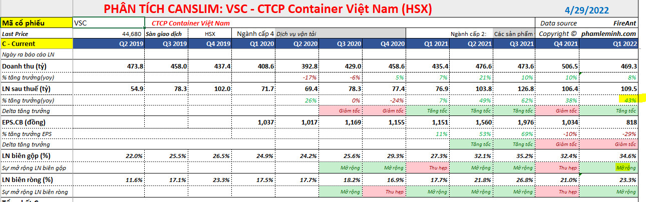 Như vậy, VSC đã có 4 quý có tốc độ tăng trưởng lợi nhuận cao từ 38% trở lên. Đáp ứng chữ C trong CANSLIM. Được biết động lực tăng trưởng đến từ càng VIP Green khi có sản lượng hàng hóa là 235,153 TEU (+2.6% yoy) trong quý 1.2022. CTCK HSC ước tính sản lượng thuê ngoài của VSC là 18,000 TEU (giảm -19% yoy).