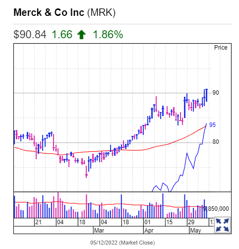 Nếu thị trường tiếp tục tăng, gã dược phẩm Merck (MRK) là một trong những cổ phiếu tăng trưởng cần được quan sát sau khi đóng cửa trên điểm mua của mẫu hình Chiếc Cốc Tay Cầm 89.58. Cổ phiếu tăng gần 2%, tạo ra chuỗi tăng giá liên tiếp. Vùng mua hợp lý 5% là 94.06.