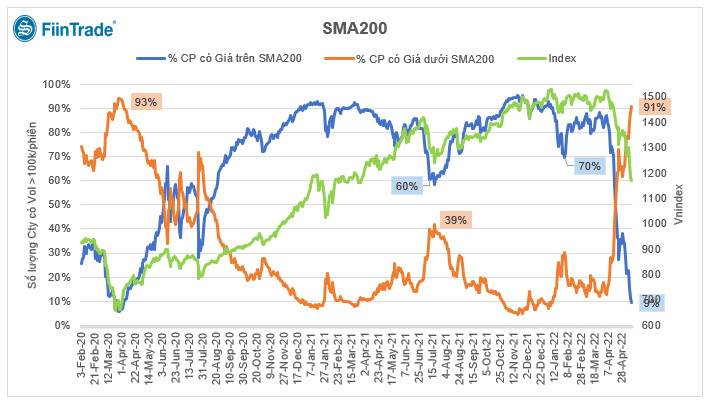 Dữ liệu thống kê cho thấy trong phiên hôm nay có 91% cổ phiếu nằm dưới MA200 ngày, gần tương đương với con số 93% của đợt khủng hoảng Covid 2020. Đó là lý do mà Team NĐT CANSLIM cho rằng thị trường đã bị bán tháo quá đà và rất dễ hồi phục kỹ thuật.