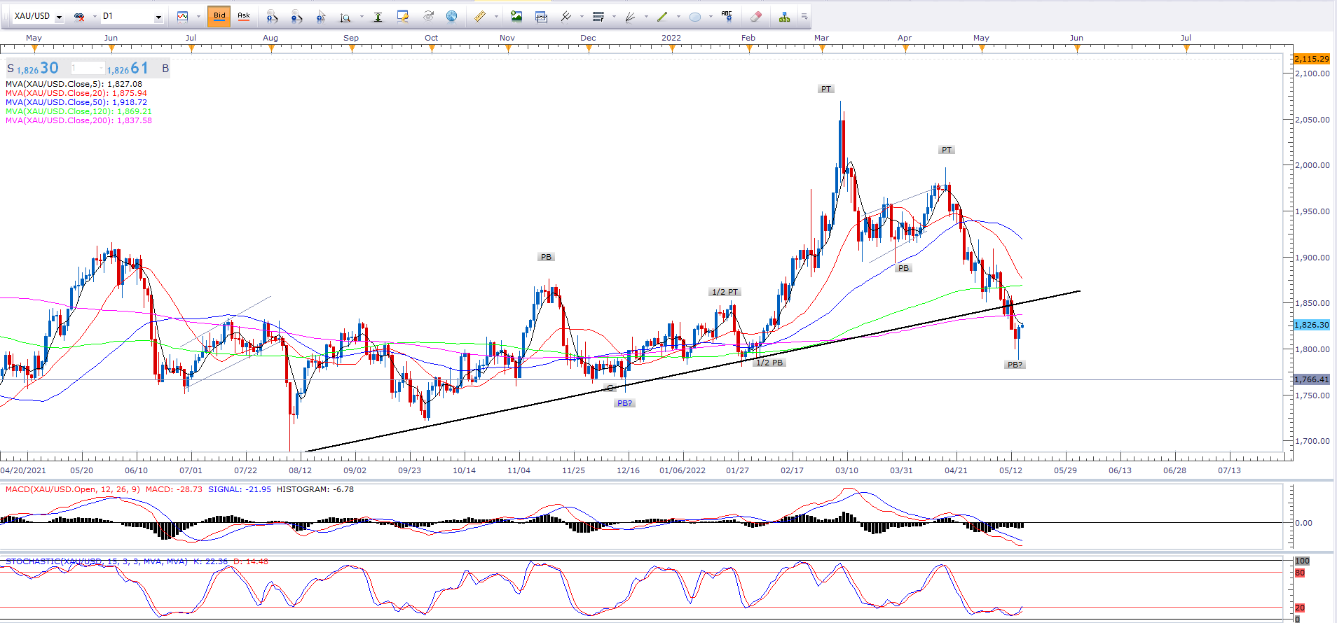 Trong ngắn hạn, giá vàng đang nằm trong khung thời gian tạo đáy MB (Major Bottom-MB), có thể xuất hiện trong tuần này. Thậm chí nếu may mắn đó có thể là đáy chu kỳ sơ câp (Primary Bottom-PB). Một khi đáy MB được hình thành, hãy tìm kiếm đợt hồi phục 3-8 ngày đưa giá hồi phục lên vùng khoảng trống giữa MA15 ngày và MA45 ngày, hiện đang ở 1900 và 1935,