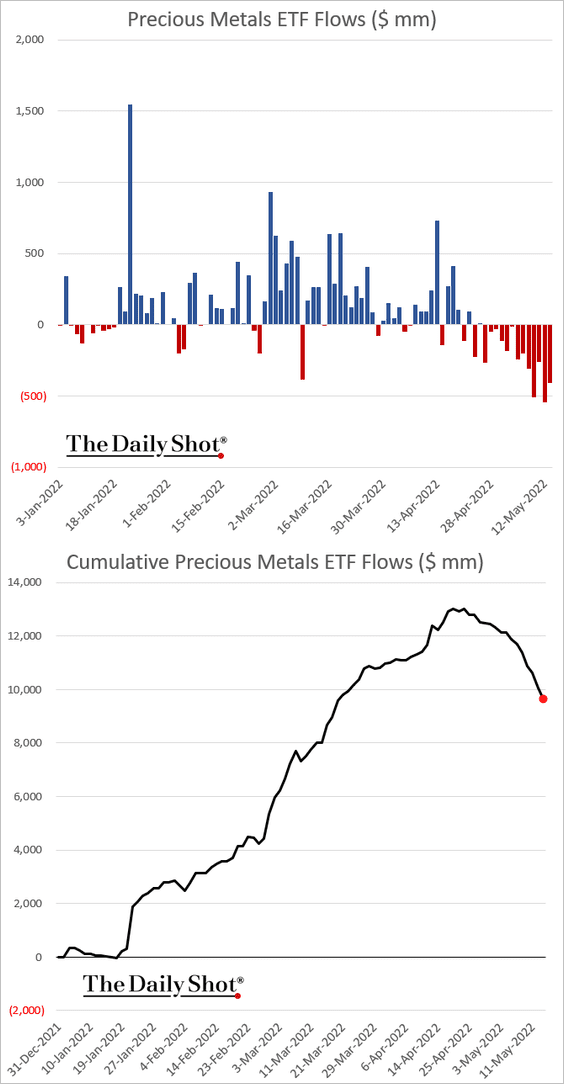 Trong khi mọi người nói đến lạm phát và kỳ vọng vàng sẽ là công cụ phòng chống lạm phát thì thực ra vàng đang bị bán ròng. Các ETF vàng đang bị rút tiền và các nhà đầu tư đang bán khống vàng. Không chỉ chứng khoán, mà vàng, bitcoin hoặc các loại tiền số đều đi xuống. Nó trông giống giảm phát hơn là đình lạm.