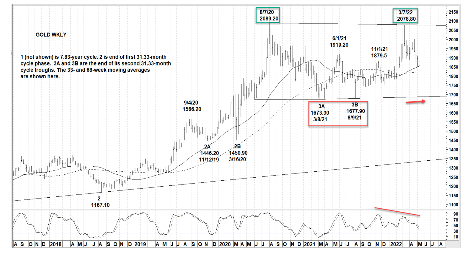 Chúng tôi ưa thích đánh nhãn tuần bắt đầu ngày 16 tháng 5 là tuần thứ 7 kể từu đáy chu kỳ sơ cấp (primary cycle- PB) tại 1888.30 vào ngày 29 tháng 3. Mức giá hiện nay thấp hơn điểm khởi đầu của chu kỳ, do đó, chu kỳ sơ cấp là giảm giá, và đáy sẽ còn tiếp tục xuất hiện trong 9-15 tuần tới. Mức đáy có khả năng trùng với đáy chu kfy 16 tháng như vừa mô tả ở trên.