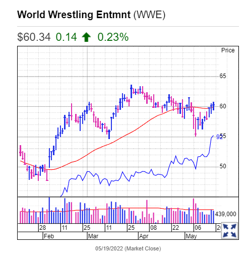 Nếu xu hướng tăng vẫn tiếp tục thì World Wrestling Entertainment (WWE) là một cổ phiếu đáng chú ý, sau khi giành lại MA50 ngày. VIệc cổ phiếu này giành lại đường MA quan trọng là dấu hiệu lạc quan cho triển vọng chứng khoán. WWE đang xây Nền Giá Phẳng với điểm mua 63.81.