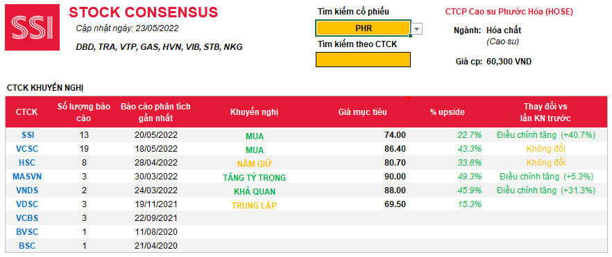 Với triển vọng tiếp tục ghi nhận tiền đền bù đất từ VSIP 3, các công ty chứng khoán đang kỳ vọng lợi nhuận năm 2022 của PHR tiếp tục tăng trưởng và vượt kế hoạch. CTCK SSI trong báo cáo ra ngày 20/5/2022 đã nâng giá mục tiêu thêm 40% lên mức 74,000 đồng/cổ phiếu. Theo Mark Minervini, đây là một trong những yếu tố cho thấy công ty đang ở giai đoạn 2 tăng trưởng (xem thêm: sách Giao Dịch Như Một Phù Thủy Chứng Khoán). Trong vòng 3 tháng gần đây, chỉ có SSI, VNDS và MASVN nâng mức định giá đối với PHR trong khi HSC và VCSC giữ nguyên.