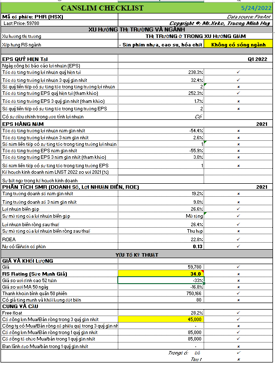 Bảng CANSLIM Checklist cho thấy PHR không đỗ tiêu chí chữ A.