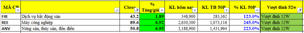 Danh sách cổ phiếu vượt đỉnh lần này có tổng cộng 3 cổ phiếu. Nhóm ngành tiện ích công cộng, dịch vụ bất động sản và thủy sản là 3 nhóm ngành đang dẫn dắt đà tăng giá của thị trường.