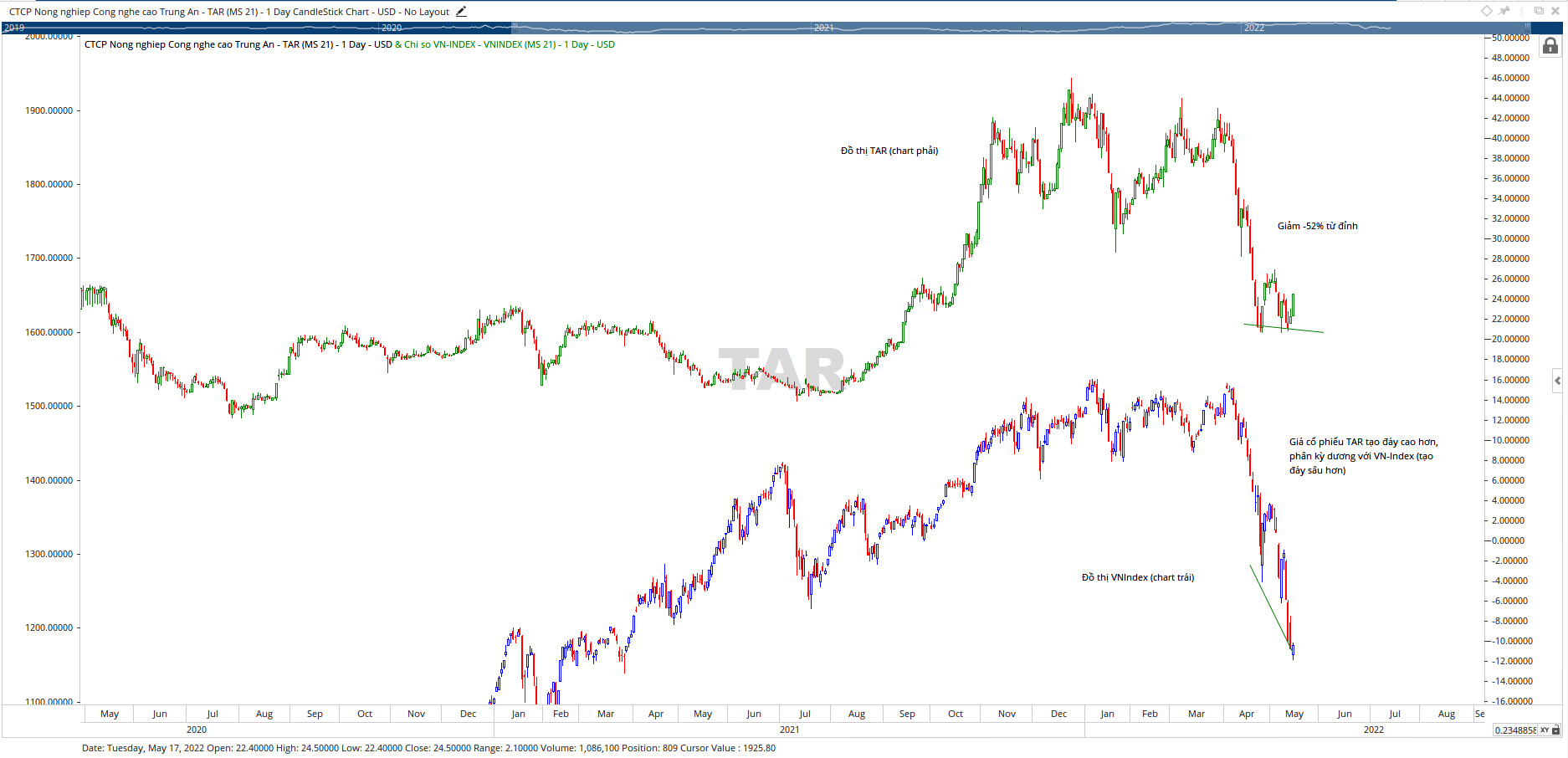 Hay tương tự là ở cổ phiếu TAR....Cổ phiếu này có sự phân kỳ dương giữa giá cổ phiếu và chỉ số VN-Index nên được đưa vào watchlist. Mặc dù TAR giảm đến -52% nhưng vẫn được xem là mức giảm bình thường. TAR hiên nay đang xây mẫu hình Hai Đáy (mẫu hình đảo chiều của Dan Zanger)