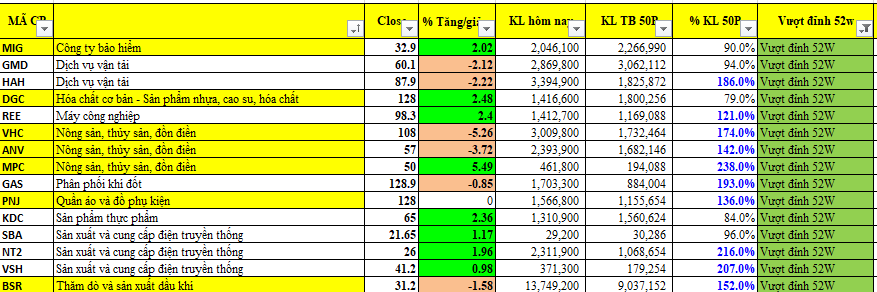 Chúng tôi tiếp tục nhìn thấy sự cải thiện trong độ rộng thị trường. Số lượng cổ phiếu vượt đỉnh 52 tuần tăng lên con số 15 mã, cao hơn 1 mã so với ngày thứ ba. Số lượng các cổ phiếu nằm trên MA50 ngày cũng tiếp tục tăng lên. Sóng ngành đang có ở: CẢNG BIỂN, HÓA CHẤT, ĐIỆN, THỰC PHẨM (THỦY SẢN), DẦU KHÍ, BÁN LẺ.