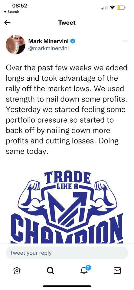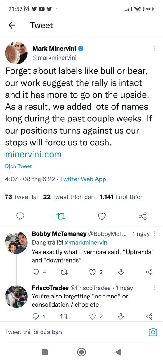 Cách đây 2 ngày, vào ngày 8/6/2022, phù Thủy Mark Minervini đăng dòng twitter cho rằng: “hãy quên cách đánh nhãn thị trường là bò hay gấu đi. Các nghiên cứu của mark cho thấy xu hướng tăng chỉ mới bắt dầu và còn nhiều không gian tăng giá. Mark đã mua nhiều vị thế trong vài tuần qua. Nếu các vị thế này sai, sẽ cắt lỗ để cầm tiền mặt”