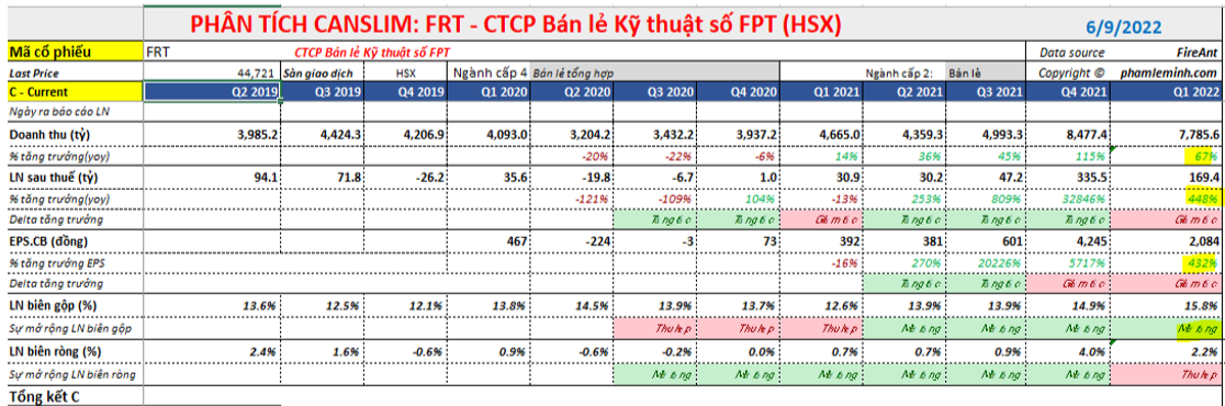 Biên lợi nhuận gộp mở rộng từ 13.9% vào quý 2.2021 lên 15.8% vào quý 1.2022. Do đó, FRT đang có mẫu hình CODE 33 của phù thủy Mark Minervini, cũng đồng thời đáp ứng chữ C của CANSLIM.