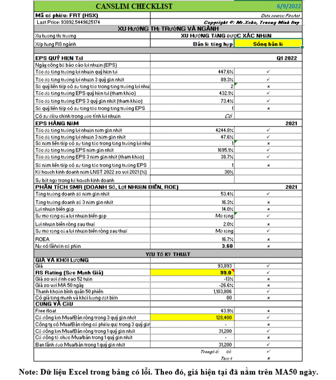 Bảng CANSLIM Checklist cho thấy FRT đỗ nhiều tiêu chí quan trọng về mặt yếu tố cơ bản và kỹ thuật để trở thành một cổ phiếu CANSLIM.