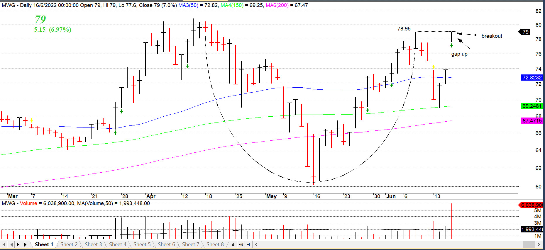 Team NĐT CANSLIM đã khuyến nghị mua MWG khi cổ phiếu này xuất hiện điểm mua Gap Up theo phương pháp của môn đệ O’Neil. Cổ phiếu MWG xây nền giá Chiếc Cốc Tay Cầm với điểm pivot=78,950. Vào cuối phiên ngày 16/6/2022, MWG đóng cửa trong sắc tím, mang tới lợi nhuận nhà các thành viên của Team NĐT CANSLIM. MWG được cho là có điểm breakout đẹp với khối lượng lớn đột biến.