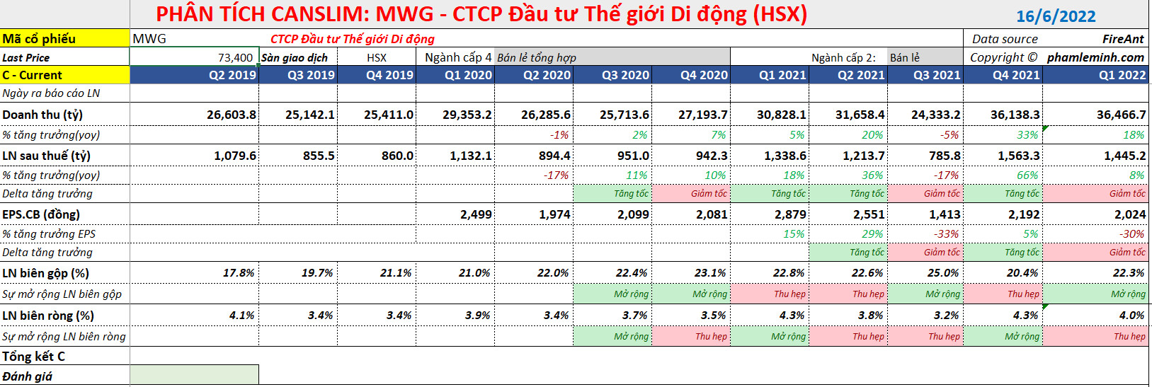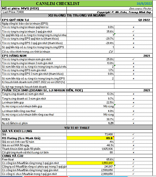 Bảng CANSLIM cheklist cho thấy MWG là cổ phiếu tăng trưởng, đạt chữ A trong CANSLIm với 2 năm tăng tốc trong tăng trưởng lợi nhuận; Xếp Hạng SMR được hạng A (cao nhất), và có cổ đông lớn mua vào hơn 3.5 triệu cổ phiếu trong 3 quý gần đây.