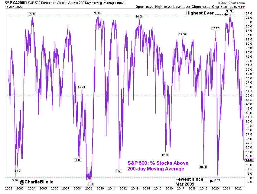 Cũng chỉ có 13% cổ phiếu còn nằm trên MA200 ngày, sắp chạm mức thấp nhất vào năm 2009 và tháng 3/2020.