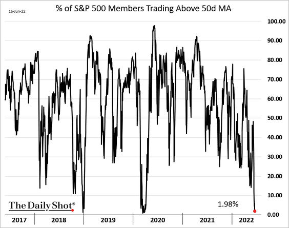 Thị trường đang bị bán quá mức với chỉ 2% cổ phiếu còn nằm trên MA50 ngày, gần chạm mức thấp nhất so với tháng 3.2020 (khủng hoảng covid) và tháng 10.2008 (khủng hoảng nợ dưới chuẩn). Thực sự, cú giảm 12% trong 10 ngày với 3 gap down là rất mạnh, để đẩy các chỉ số rơi vào tình trạng bán quá mức.
