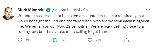 Phù thủy Mark Minervini cho rằng thi trường vẫn chưa phản ánh hết khả năng có suy thoái kinh tế hay không. Tín hiệu của Mark Minervini là Sell, và vẫn nằm nhiều tiền mặt.