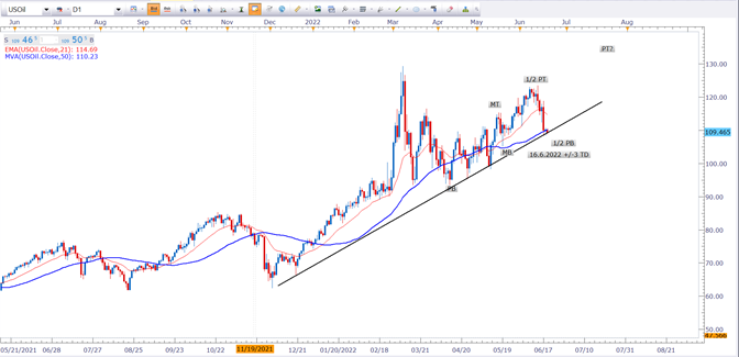 Giá dầu thế giới đang kéo về ngưỡng 109 USD/thùng và chạm vào đường MA50 ngày đồng thời là đường trendline từ chân sóng lớn vào tháng 11 năm 2021, lúc giá dầu chỉ xấp xỉ 70 USD/thùng. Đây là ngưỡng hỗ trợ của giá dầu và kỳ vọng giá dầu sớm quay trở lại xu hướng tăng.
