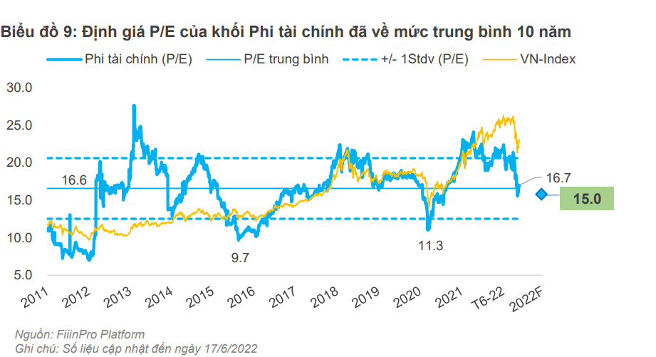 Trong báo cáo mới đây nhất của FiinGroup, đối với mảng Phi tài chính: sau các đợt điều chỉnh mạnh gần đây, P/E trượt 12 tháng giảm về 16.7x, nhưng không thực sự hấp dẫn với P/E dự báo năm 2022 ở mức 15.0x (dựa trên kế hoạch tăng trưởng LN 2022 +11.1%).
