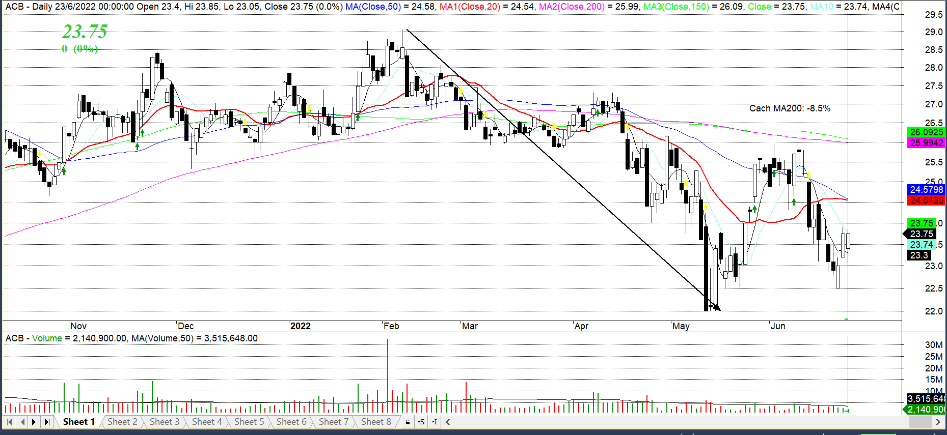 Trên đồ thị giá, ACB cũng là cổ phiếu nằm gần MA200 ngày nhất – chỉ cách 8.5%. Trong khi thị trường chung điều chỉnh giảm -24% từ đỉnh thì ACB cũng thuộc nhóm giảm ít nhất trong khối ngân hàng, mức độ giảm giá cũng chỉ -24.3%