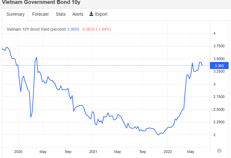 Đồ thị lợi suất trái phiếu chính phủ Việt Nam kỳ hạn 10 năm đã tạo đỉnh ngắn hạn sau khi chạm phải vùng kháng cự cứng được hình thành trước đó. Như các bảng tin trước chúng tôi đã đề cập, lợi suất trái phiếu giảm sẽ giúp TTCK tăng giá.