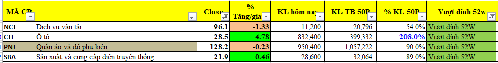 Hôm nay số lượng cổ phiếu phá đáy 52 tuần giảm còn lại 1 cổ phiếu, có 4 cổ phiếu tham gia vào danh sách cổ phiếu vượt đỉnh 52 tuần.