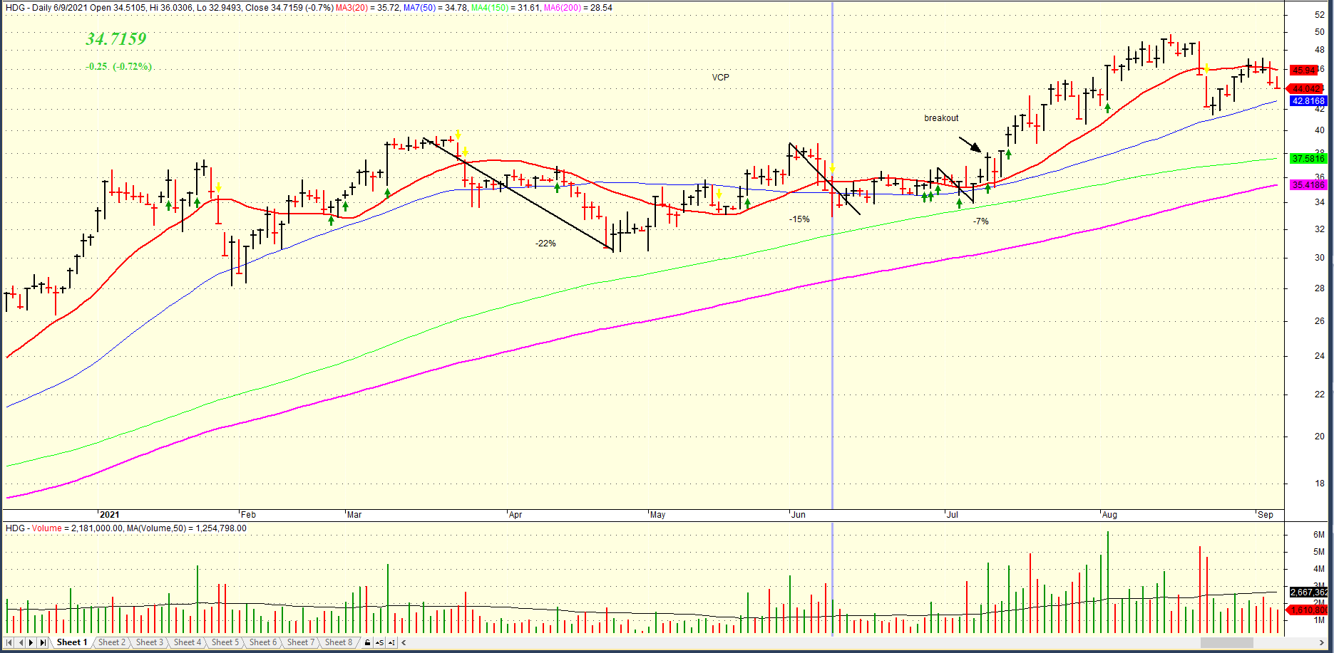 Lấy ví dụ về cổ phiếu HDG vào tháng 7.2021. Cổ phiếu HDG tạo đáy trước thị trường chung và set up mẫu hình VCP với 3 vòng thu hẹp lần lượt -22%; -15% và 7%. Ngày 08.07.2021, HDG chính thức breakout khỏi mẫu hình VCP và sau đó liên tục thiết lập đỉnh cao mới trong bối cảnh thị trường chung vẫn chưa tạo đáy.