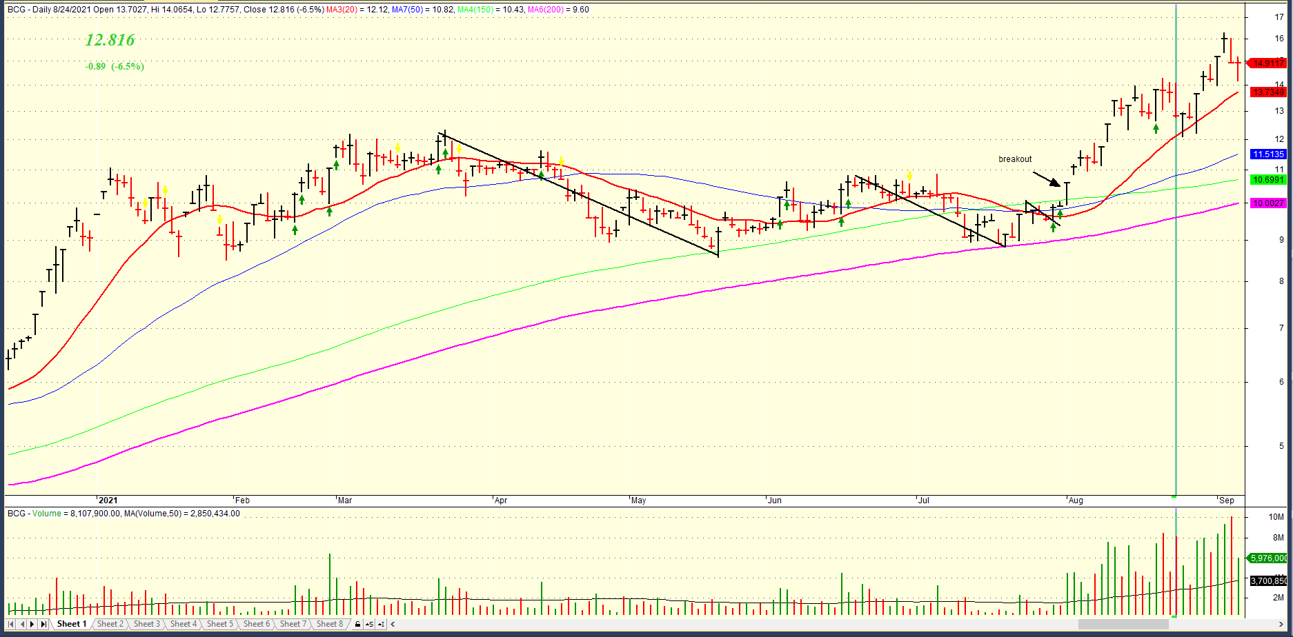 Như vậy, có thể thấy HDG là cổ phiếu dẫn dắt và đại diện cho nhóm năng lượng và bất động sản. Hơn 1 tháng sau, BCG cũng breakout mẫu hình VCP với 3 vòng thu hẹp và trở thành siêu cổ phiếu tăng giá mạnh. Ngay khi BCG tăng lên mạnh mẽ, liên tục thiết lập các đỉnh cao mới thì HDG lại điều chỉnh giảm nhẹ về MA50 ngày để tiêu hóa toàn bộ xu hướng tăng giá trước đó.