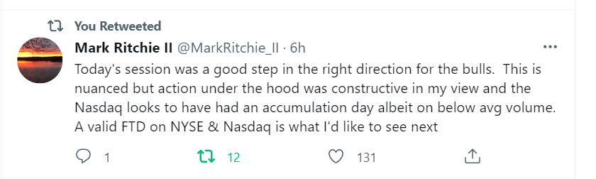 Nhận định của một số phù thủy chứng khoán. Mark Ritchie II nói rằng: “Hành động của ngày hôm nay là một bước đi tốt theo đúng chiều hướng của xu hướng tăng. Đây là một điều tích cực nhưng hành động vẫn cần thêm thời gian tích lũy mang tính kiến tạo hơn, và Nasdaq trông có vẻ có một ngày tích lũy mặc dù khối lượng thấp hơn mức trung bình. Một ngày FTD giá trị ở sàn NYSE và Nasdqa là điều tôi muốn nhìn thấy tiếp theo.