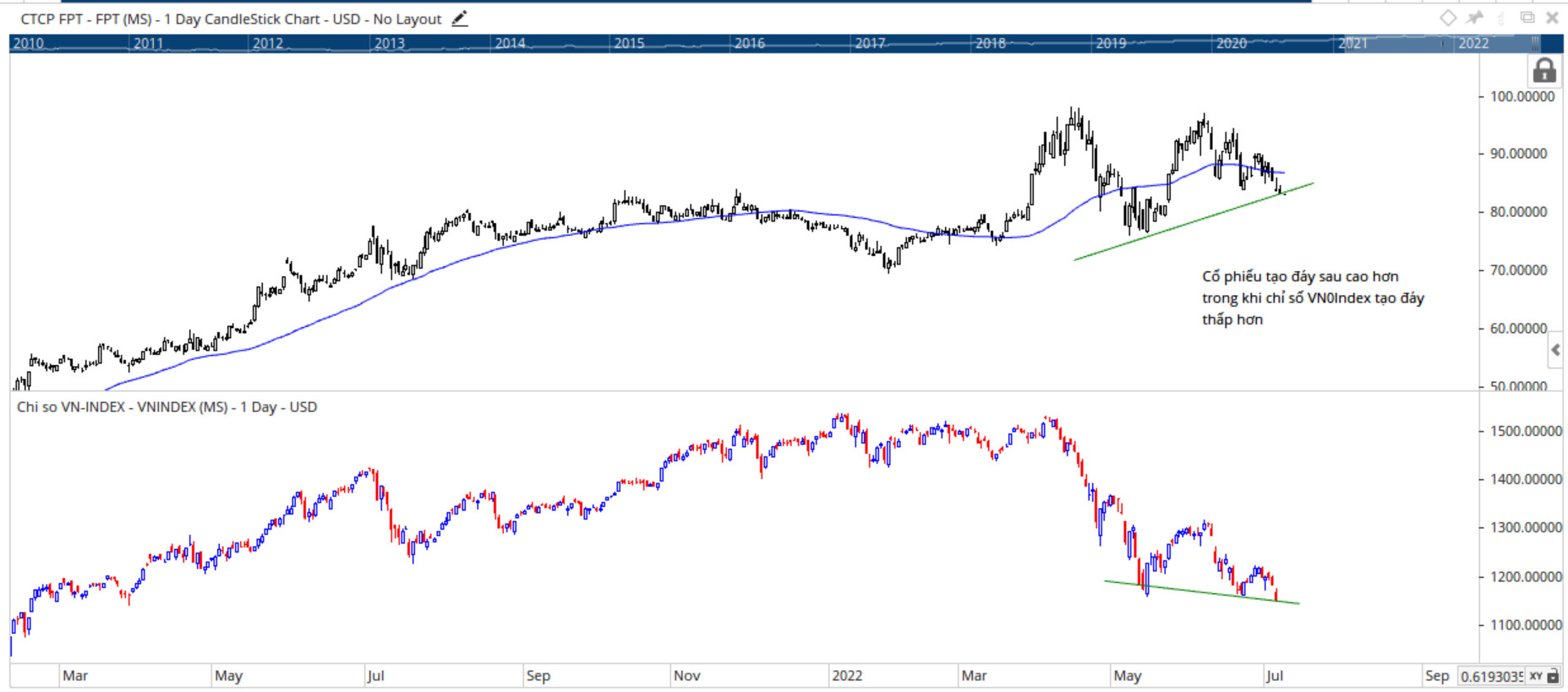 Về đồ thị giá, FPT đang có sự phân kỳ dương với chỉ số VN-Index, một dấu hiệu cho thấy cổ phiếu này có sự kháng cự mạnh mẽ trong thị trường con gấu.