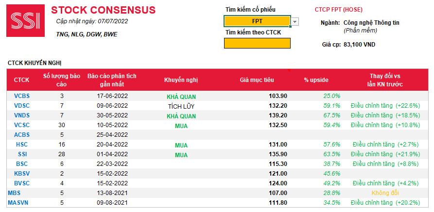 Trong báo cáo mới phát hành ngày 6/7/2022, CTCK HSC cho biết nâng giá mục tiêu đối với FPT thêm 16% lên mức 127,500, từ mức 110,000 của kỳ báo cáo trước đó. Mục tiêu giá này hàm ý khả năng tăng giá thêm 53% từ thị giá hiện tại. HSC tin tưởng vào việc FPT sẽ hưởng lợi từ việc nhu cầu chuyển đổi số ngày càng cao.