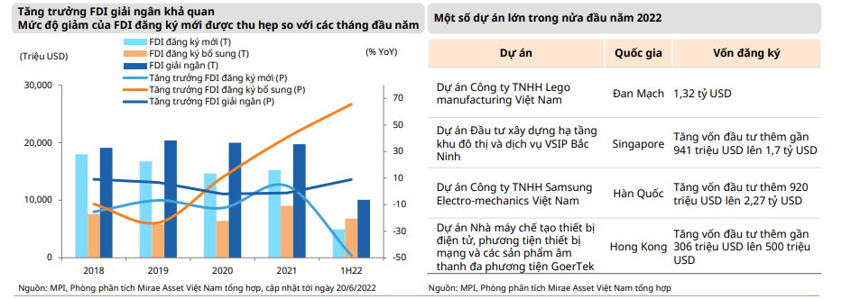 - Vốn FDI giải ngân nửa đầu năm đạt mức cao nhất trong 5 năm qua. vốn FDI đăng ký kì vọng hồi phục nhờ chính sách đi lại giữa các nước dần trở lại bình thường, tạo điều kiện thuận lợi cho việc khảo sát và làm các thủ tục đầu tư.