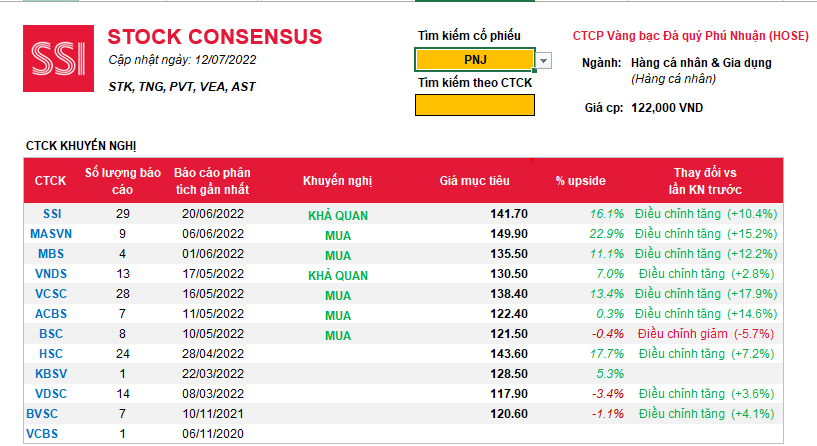 Theo bảng SSI Stock Consensus, thì trong vòng 3 tháng gần đây, nhiều công ty chứng khoán đã tăng giá mục tiêu của PNJ do triển vọng lợi nhuận tích cực