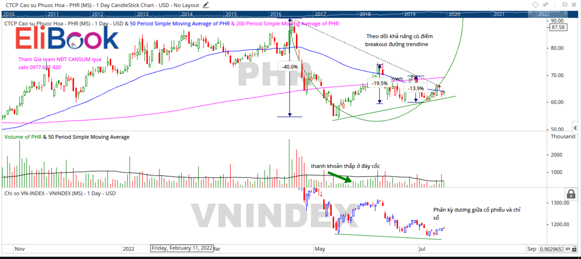 Không những thế, PHR hình thành sự phân kỳ dương với chỉ số VN-Index (tạo đáy sau thấp hơn). Để nhận được tư vấn về tín hiệu mua đối với cổ phiếu PHR, vui lòng tham gia Team NĐT CANSLIM qua zalo 0977.697.420