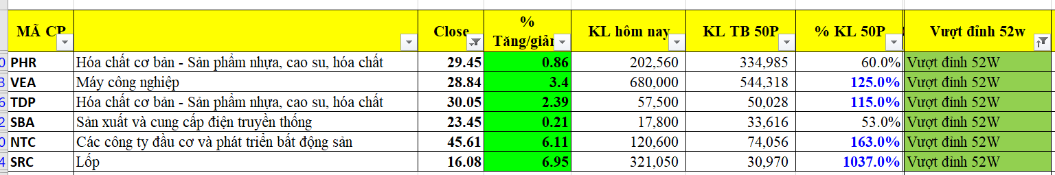 Trong danh sách 6 cổ phiếu vượt đỉnh, chỉ có 3 cổ phiếu được đánh giá là có đầy đủ các tiêu chí trở thành cổ phiếu dẫn dắt đó chính là PHR, VEA và NTC. Số lượng cổ phiếu vượt đỉnh 52 tuần và có dấu hiệu trở thành cổ phiếu dẫn dắt tăng dần lên nhiều bắt đầu từ tuần thứ 3 sau khi ngày Bùng nổ theo đà (FTD) xuất hiện.
