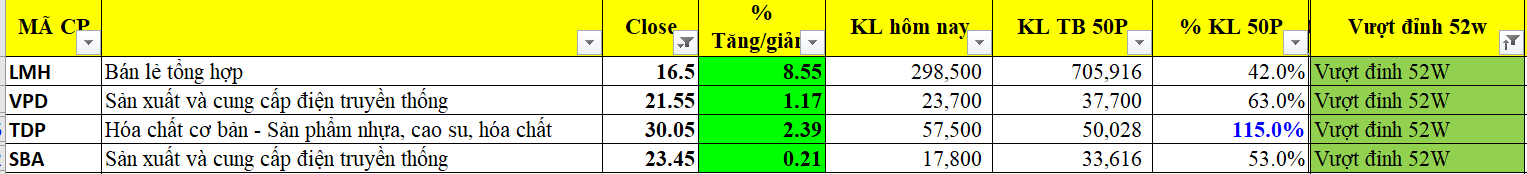 Kết thúc tuần giao dịch 23.07, số lượng cổ phiếu phá đáy 52 tuần tổng cộng có 3 cổ phiếu và số lượng cổ phiếu vượt đỉnh tăng lên 4. Nhóm ngành điện đang có thấy sự nổi trội với 2 cổ phiếu vượt đỉnh 52 tuần.